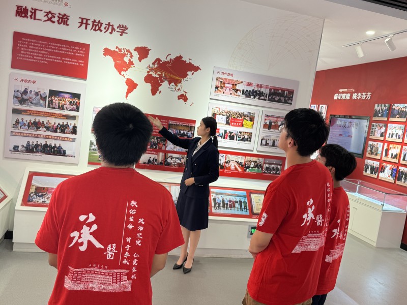 7月9日,实践队全体成员在校史馆开启实践第一课。在讲解员的带领下,队员们驻足于一幅幅泛黄的老照片前,聆听红医故事。从抗战时期校友在战火中坚持医学教育的坚守,到改革开放后科研团队攻克疑难病症的突破,再到新时代青年医者扎根基层的奉献,校史馆里的每一件展品都诉说着“医者仁心”的传承。队员们纷纷感慨道:这些前辈用行动告诉他们,医者的使命不仅在于治病,更在于救人。