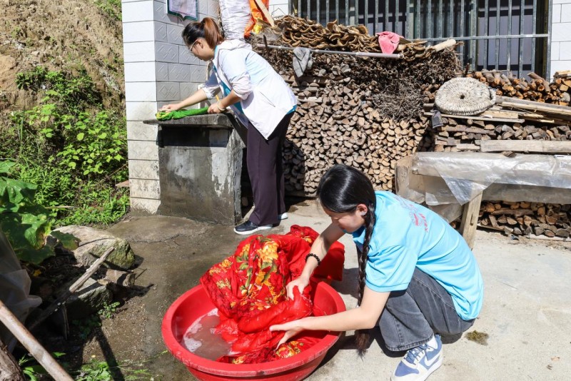 在看到烈日下全身汗湿的爷爷在洗着厚重的被子,团队两位成员积极上前帮忙,开启“温情洗护”行动。尽管缺乏经验,她们也认真反复的搓洗,直到被子干净为止,从满是泡沫的双手,到洁净蓬松的被子,这不仅是为老人分担家务,更是在传递对村民的深切关怀,让乡村烟火日常,多了份青春守护的温暖底色。