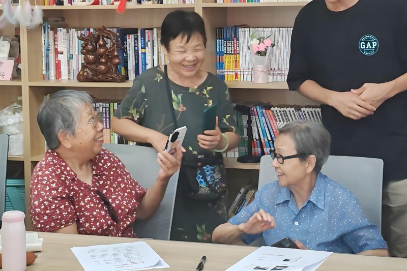 教学环节更是按需定制,PPT搭配清晰的步骤图,纸质资料也同步向老人发放,实践队员一步步演示,老人们跟着实操,会操作的老人更是成了小老师。刘阿姨耐心帮师阿姨找拍照角度,传授自己的构图心得;张奶奶耳朵不太灵巧,其他人便主动提高说话音量,周围的老人也主动帮忙复述转达内容;凤阿姨更是活学活用,现场就主动加起其他老人的微信,谢奶奶忙不迭翻开微信二维码,王奶奶也笑着把手机递过去,扫码的“嘀”声混着“以后天天在微信里晒照片”的笑声,整个活动室都溢满了欢声笑语。