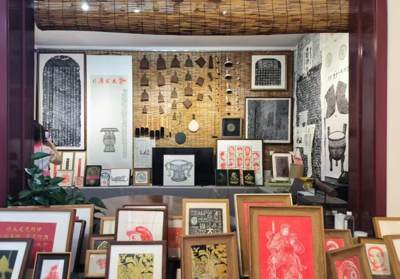 移步二楼,文物与拓本相互呼应,构成鲜活的历史课堂。古老的金石器物陈列其间,斑驳锈迹诉说岁月沧桑,与之对应的拓本,精准复刻纹理与文字。在讲解中,成员们了解到,拓印曾是古籍修复、金石研究的重要手段,无数珍贵历史信息借由拓印留存。透过拓本,大家触摸到历史脉络 —— 商周青铜器的铭文拓片见证古代礼制,汉代石碑拓本还原书法演变。先辈们以拓印为 “时光相机”,让千年文化遗产重焕生机,这也让团队深刻意识到非遗传承的价值,为后续深入实践筑牢认知根基。