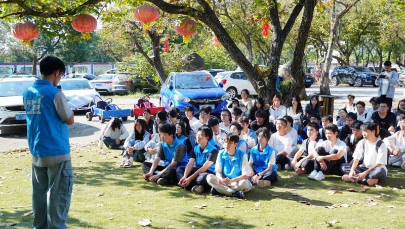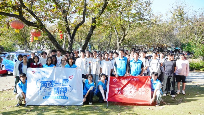2025年11月16日,桂林航天工业学院“核聚星火 芯码筑梦”桂航星火燎原服务队走进桂林市七星区社山桥社区,在社区绿树成荫的户外活动区域,为48名中学生带来了一场沉浸式两弹一星精神宣讲活动。枝头点缀的红色灯笼添了几分暖意,服务队成员身着印着“两弹一星精神”的蓝色志愿服,和围坐草地的青少年们形成了温暖鲜活的互动场景。