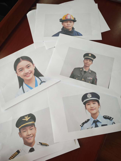 互动环节中,志愿者们问起孩子们未来的职业理想,孩子们纷纷踊跃发言,分享了自己的梦想。警察、军人、消防员、医生、老师……这些崇高的职业理想在孩子们心中闪闪发光。了解到孩子们心中的梦想职业后,用AI让孩子们梦想成真,将那些稚嫩的憧憬瞬间具象化,一张张孩子们身着未来职业装束、栩栩如生的照片呈现在眼前,为他们打开了一扇通往未来的窗户。