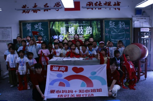 合影时,黑板上 “舞蝶鼓韵” 主题鲜明,孩子们手持红绸,脸上笑意灿烂,“湖南爱心妈妈 + 知心姐姐结对关爱行动” 的旗帜,见证这场温暖相遇。