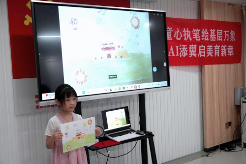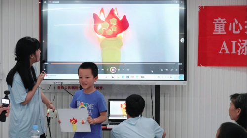 令人瞩目的是,实践队还巧妙地将AI技术融入美育教学之中。他们利用先进的图像处理与动画制作软件,将孩子们的作品进行数字化处理,使其“动”了起来。当看到自己笔下的天安门和手中的火把在屏幕上栩栩如生时,孩子们的脸上洋溢着惊喜与自豪的笑容。这种全新的教学方式不仅极大地提升了孩子们的学习兴趣,更让他们在实践中感受到了科技与艺术的完美融合。