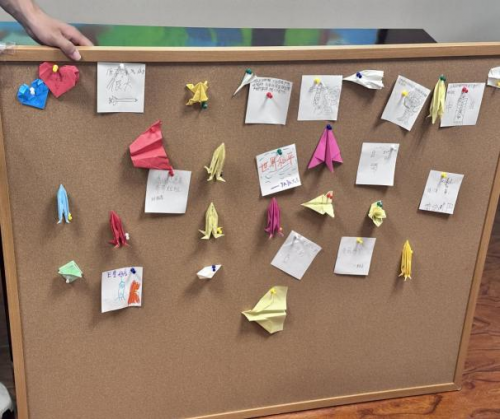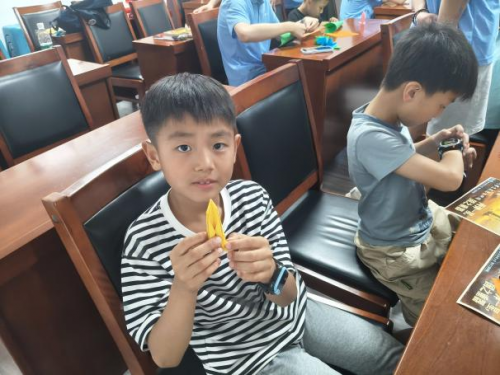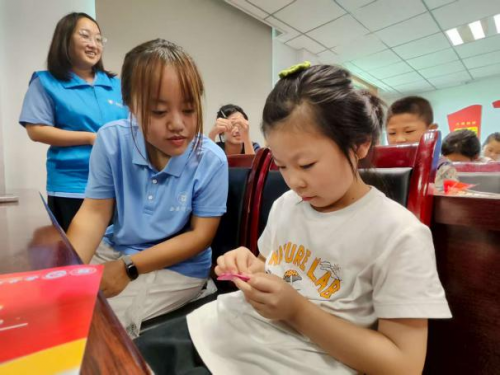 实践团成员指导孩子们“航天筑梦”折纸和展板寄语
