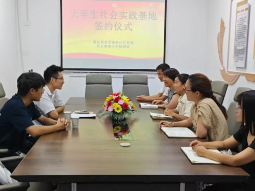 7月18日,实践团队与香溪路社区共建大学生社会实践基地。双方签署协议并揭牌,明确在支部共建、基层治理等领域的合作机制:社区提供志愿服务、文化宣传等实践岗位;学院发挥专业优势助力社区发展。此次共建标志着从“活动育人”向“机制育人”跨越,构建起服务社会与青年成长“双向赋能”的长效平台。