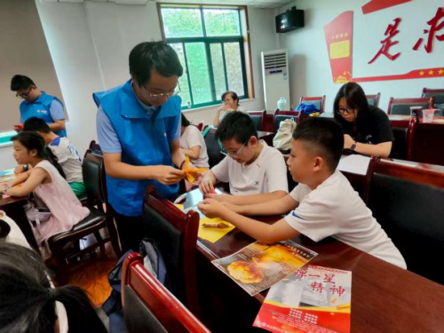 7月8日、10日,实践团队走进长安区香溪路社区、凤林社区托管班,通过故事讲述+互动体验开展儿童宣讲。宣讲员以“两弹一星”元勋事迹为引,用通俗语言诠释“热爱祖国、无私奉献,自力更生、艰苦奋斗,大力协同、勇于登攀”的精神内核。孩子们在“航天筑梦”折纸环节制作“小火箭”,于展板书写“向科学家致敬”“强国有我”等真挚寄语。活动将红色种子播撒童心,筑牢少年科技报国信念根基。