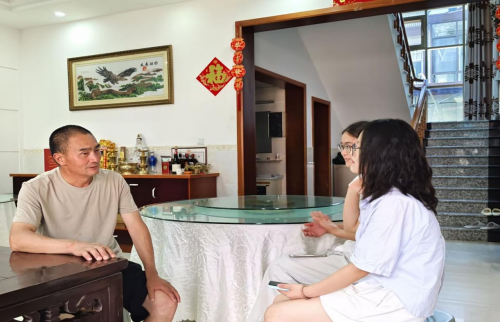 (图为6月29日,垛田青耘实践团队成员杨嘉璐和刘贤对当地民宿老板进行采访调研。陈梦微供图)